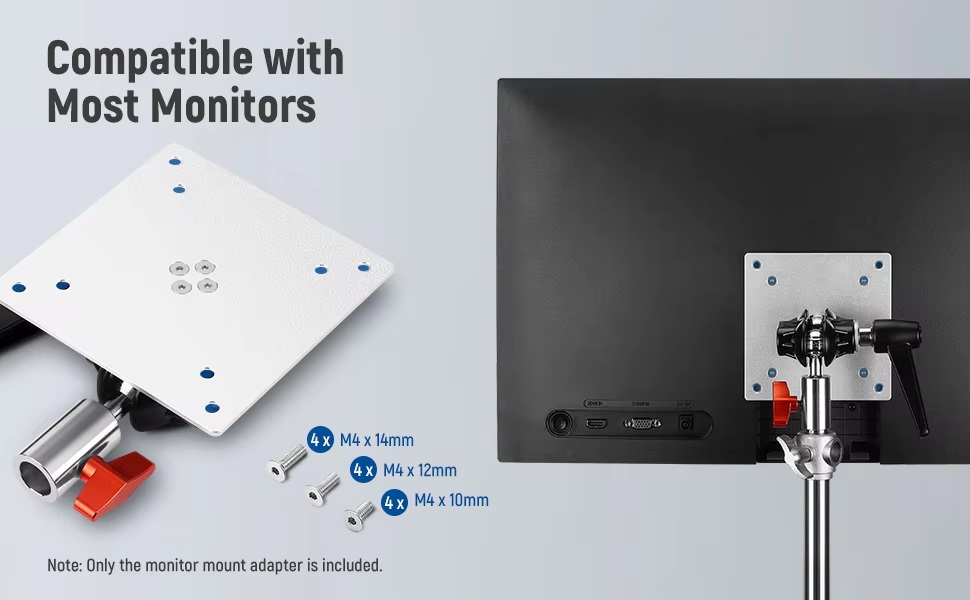 Khả năng tương thích VESA tiêu chuẩn Bộ điều hợp gắn màn hình có vòi VESA 75 và 100mm (3 và 4 ") để gắn chắc chắn, an toàn vào màn hình.Ốc định vị 5/8 "phù hợp cho các chân đèn chuyên nghiệp và các phụ kiện khác Gắn liền với các khớp bóng để định vị linh hoạt, bộ thu tiêu chuẩn công nghiệp 5/8 "sẽ phù hợp với hầu hết các giá đỡ hoặc phụ kiện có đinh hoặc ghim 5/8".