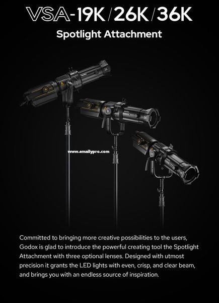 Linh hoạt và đa năng: Bộ hiệu ứng Godox Spotlight VSA-19K/26K/36K tương thích với nhiều loại đèn Godox khác nhau, mang đến sự linh hoạt tối đa trong quá trình sử dụng. Bạn có thể dễ dàng thay đổi kích thước, hình dạng chùm sáng, tạo ra vô số hiệu ứng ánh sáng khác nhau.