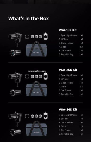 Bộ Hiệu Ứng Godox Spotlight VSA-19K/26K/36K là sự lựa chọn hoàn hảo cho những ai đam mê ánh sáng và muốn tạo ra những tác phẩm nghệ thuật độc đáo, ấn tượng. Hãy trang bị ngay cho studio của bạn bộ hiệu ứng này để khám phá những khả năng sáng tạo vô tận!