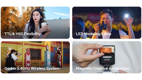 Đèn flash nhỏ gọn 4 x 2,2 x 1,5 inch này có bộ khuếch tán góc rộng trong suốt, cùng với tấm chắn sáng màu trắng cho các tùy chọn tùy chỉnh ánh sáng khác nhau. Ngoài ra còn có cảm biến quang điện và cổng dây đồng bộ. Sử dụng giao diện USB-C để sạc và nhận bản cập nhật firmware. Godox bao gồm cáp sạc USB-C, chân đế mini từ tính, bộ khuếch tán, hai bộ lọc màu từ tính và một túi đựng đơn giản để cất giữ và vận chuyển.