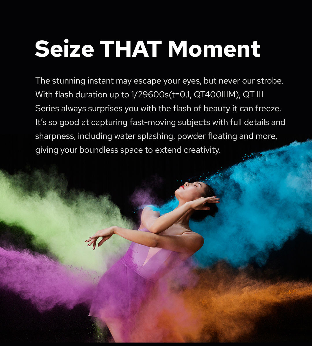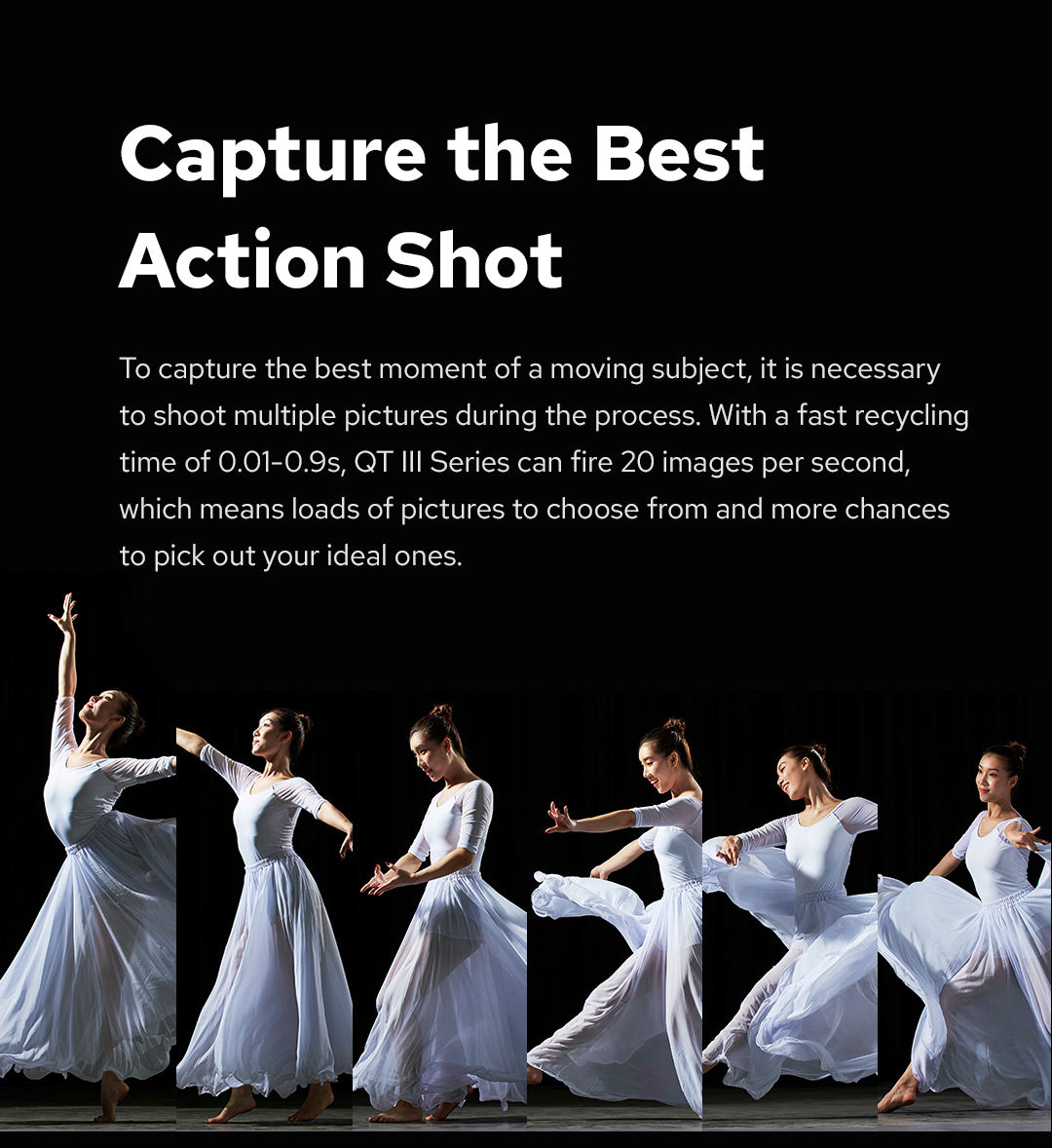 Với tốc độ hồi đèn nhanh như chớp, QT400III-M giúp bạn không bỏ lỡ bất kỳ khoảnh khắc quan trọng nào. Điều này đặc biệt hữu ích trong các buổi chụp hình cưới hoặc chụp thời trang, nơi mà thời gian là yếu tố then chốt.