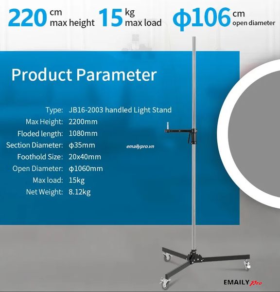 - Thiết Kế Chắc Chắn và Di Động: Với phần đế thấp và chắc chắn, chân đèn Jinbei JB-16 đảm bảo sự ổn định cho thiết bị chiếu sáng của bạn, ngay cả khi phải chịu tải trọng lớn. Bánh xe tích hợp giúp việc di chuyển chân đèn trở nên dễ dàng và thuận tiện hơn bao giờ hết, đặc biệt hữu ích trong các studio có không gian rộng.