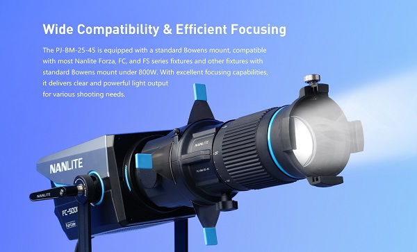 PJ-BM-25°-45 tương thích với đèn chiếu sáng dòng Forza/FS/FC có gắn Bowens. Sản phẩm bổ sung chức năng zoom xoay cho phép điều chỉnh góc chùm tia từ 25° đến 45° liên tục, giúp cải thiện đáng kể hiệu quả lắp đặt đèn chiếu sáng.
