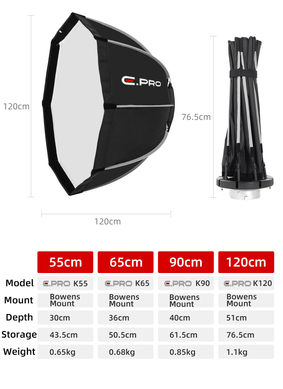 SOFTBOX E.PRO QUICK OCTAGON được thiết kế theo hình dáng Parabol mang lại ánh sáng mềm mại, tập trung với các cạnh sắc nét. Bên cạnh đó, Parabolic Softbox có thể cầm tay và dễ dàng lắp đặt một cách nhanh chóng, tiện lợi, phù hợp và đáp ứng trong nhiều trường hợp khác nhau.