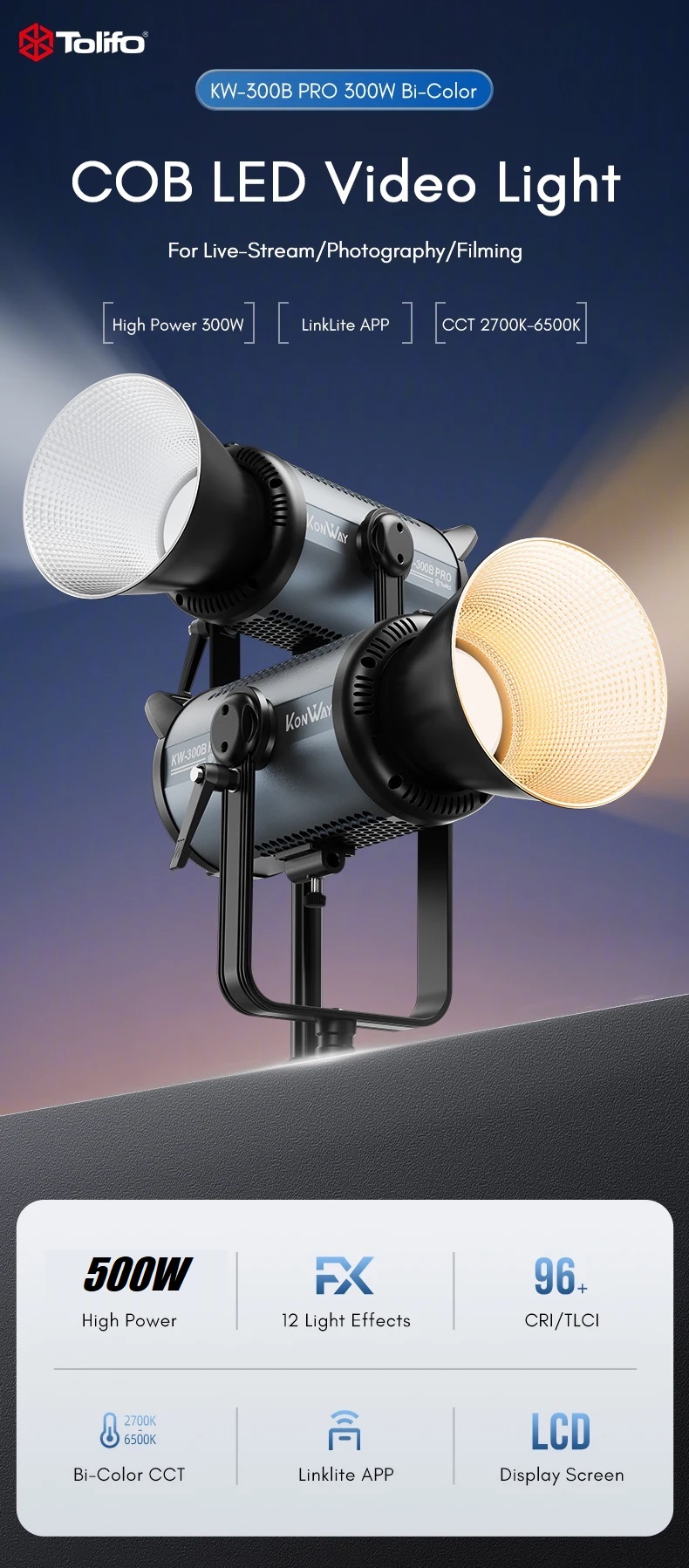 Đèn LED Tolifo KW-500B Pro 500W Bicolor COB là một công cụ mạnh mẽ và linh hoạt, đáp ứng mọi nhu cầu ánh sáng của bạn trong lĩnh vực quay phim, chụp ảnh và livestream. Với những tính năng ưu việt và chất lượng vượt trội, đây là một sự đầu tư xứng đáng cho sự nghiệp sáng tạo của bạn.