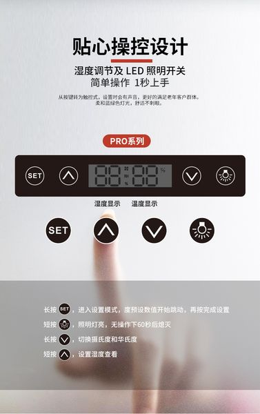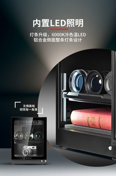Tủ được trang bị ẩm kế điện tử hiển thị độ ẩm bên trong tủ một cách chính xác. Bạn có thể dễ dàng theo dõi và điều chỉnh độ ẩm sao cho phù hợp với yêu cầu bảo quản của các thiết bị nhiếp ảnh.